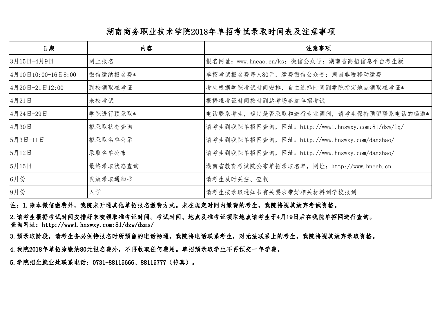 湖南商务职业技术学院2018年单招考试录取时间表及注意事项