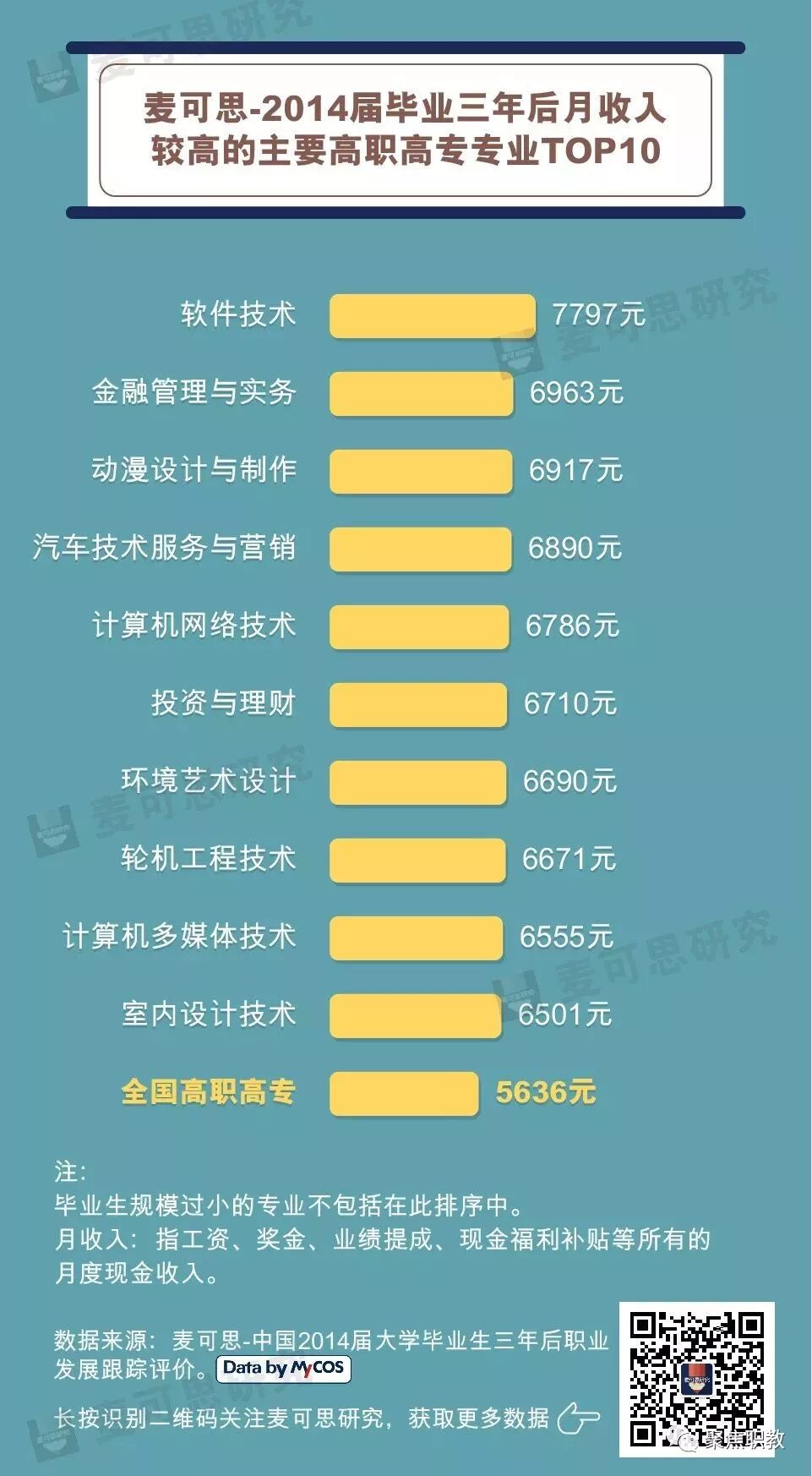 麦可思数据显示,2014届高职高专毕业生三年后平均月收入为5636元。具体到专业层面,软件技术专业三年后平均月收入最高,为7797元;其次是金融管理与实务专业,月收入为6963元。