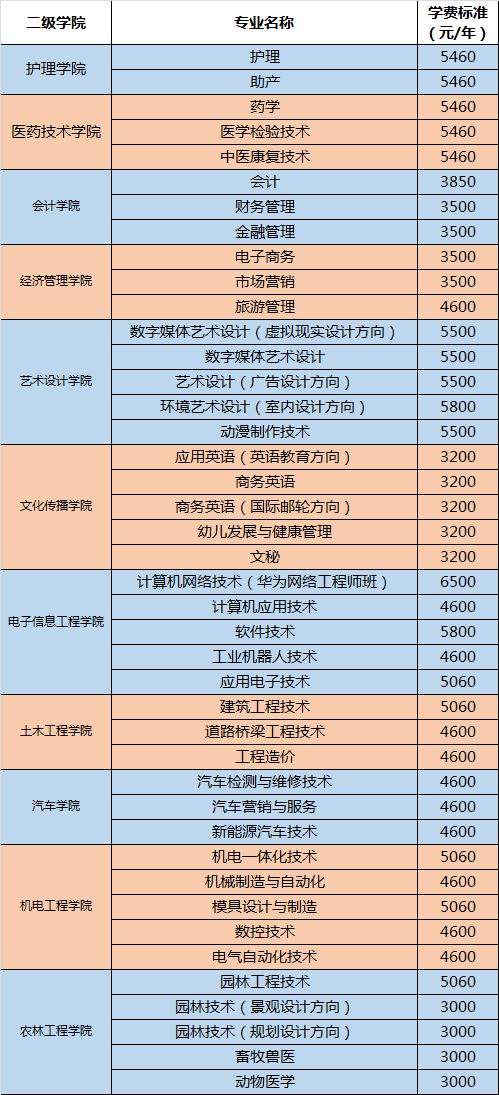 2019年单独招生专业及学费标准
