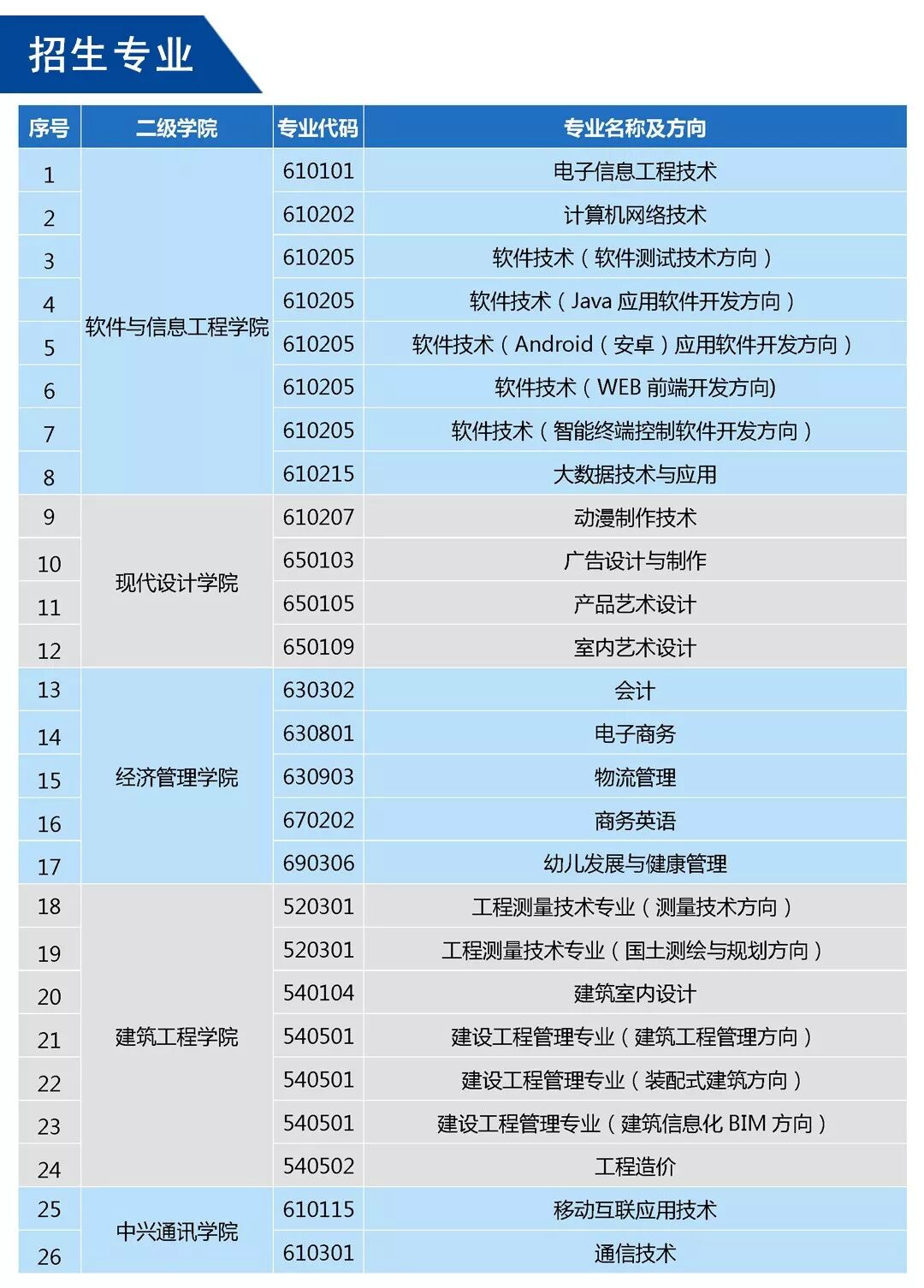 软件与信息工程学院 软件技术专业(Java应用软件开发方向) 就业方向:培养具有良好的Java软件开发功底,能从事移动通信、金融、电子商务、电子政务等行业领域Java企业级软件产品程序设计与开发维护工作的应用型高端技能人才。主要从事Java软件开发工程师、Java Web开发工程师、Java程序员等工作。 电子信息工程技术 就业方向:培养具有电子技术相关理论知识和应用能力,在大中型企业、消费类电子产品等企业从事智能电子产品的设计、开发、生产、销售以及现代电子设备的安装、调试与维护等工作的高素质应用型高技能专门人才。 主干课程:电子技术、电子产品制图与制版、中小型电子产品设计与制作、单片机原理及应用、电子产品生产工艺与管理、电子产品整机维修与检测、SMT制程与设备维护、嵌入式技术基础。 现代设计学院 动漫制作技术(省级特色专业、省级示范特色专业群核心专业) 主干课程:动画美术基础、动画主流软件、动画基础理论、CG绘制、动画运动规律、动画编剧与分镜头设计、动画模型制作、动画制作、材质与灯光渲染、输出与合成技术、动画特效制作、工业动画、VR制作、游戏制作、动画短片创作等。 就业方向:主要面向动画、影视、游戏、网络新媒体、新闻出版、电视台、广告、教育、科技等企事业单位的各类动画制作、特效制作、CG美术、影视合成、插画制作、动漫美术创作、导演、编剧、游戏制作、VR制作等岗位群培养“精制作、通设计、能创业”高素质技术技能动漫制作人才。如:游戏制作师、分镜师、动画师、特效师、插画师、VR制作师、动画导演、美术师、编剧、职业经理人等。 广告设计与制作(省级示范特色专业群核心专业) 主干课程:广告美术基础、主流广告设计软件、广告基础理论、字体设计、VI设计、版式设计、包装设计与制作、书籍装帧设计、广告策划、影视广告、影视广告创作、广告设计实务、综合实训等等。 就业方向:主要面向广告、传媒、美术设计、新闻媒体、包装制作、印刷制作、出版集团、网络媒体、策划、电视台等相关企事业单位从事广告设计与制作、包装设计、 企业形象设计、排版印刷、商业摄影、广告策划与推广等岗位群培养“精制作、通设计、能创业”高素质技术技能广告制作人才。如:广告设计师、图形图像制作师、包装设计师、VI设计师、插画设计师、摄影摄像师、策划师、职业广告人等。 室内艺术设计(省级示范特色专业群重点专业) 主干课程:室内美术基础、室内设计基础理论、主流室内设计软件、手绘设计技法表现、人机工学、装饰材料与施工工艺、施工图设计与制作、空间设计与效果图表现、住宅空间设计与表现、家具与陈设设计、商业空间设计与表现、展示设计,综合实训等。 就业方向:主要面向家装、工装、展示设计、家具与建材、地产、效果表现、室内软装饰、设计规划院等企事业单位从事室内空间设计与表现、施工与项目管理、预算与采购、配饰与展示设计、销售服务等岗位群培养“精制作、通设计、能创业”高素质技术技能室内设计人才。如:室内设计师、家具设计师、展示师、陈列设计师、3D效果图设计师、施工图设计师、配饰设计师、职业经理人等。 产品艺术设计(省级示范特色专业群重点专业) 主干课程:美术设计基础、产品设计造型基础理论、产品设计主流软件、手绘表现技法、人机工程学、工业设计方法学、三视图制作、计算机效果表现、产品造型设计、产品形态设计(工业产品、玩具、饰品、礼品设计),包装设计、展示与陈列设计、设计材料与技法、设计管理等。 就业方向:主要面向玩具、生活用品、礼品、科技、广告、美术设计、动漫与游戏、包装、旅游景区、特产公司等等企事业单位的各类玩具设计、工业产品造型设计、旅游工艺品设计、礼品设计、包装造型、动漫衍生产品设计等岗位群培养“精制作、通设计、能创业”高素质技术技能产品艺术设计人才。如:动漫衍生品设计师、产品设计师、旅游工艺品设计师、工业造型师、包装师、礼品设计师、玩具设计师、展示陈列师、职业经理人等。 经济管理学院 会计 主干课程:基础会计、财务会计、成本会计、税务会计、电算会计、行业会计、企业财务管理等。 就业方向:外经贸各部委、贸易公司、涉外机构、外商投资企业、跨国公司、金融国贸等单位的文秘、翻译、业务人员或行政管理人员。 物流管理 主干课程:开设仓储与配送管理、货运代理、物流地理、物流金融、快递实务、采购管理、报关实务、企业物流管理、电子商务、会计基础等专业核心课程。 就业方向:采购员、仓储业务操作员、报关员、国际货运代理员、高级外贸跟单员、车辆调度管理员、配送员、物流信息管理员、助理国际物流师、物流客服管理等。 建筑工程学院 建设工程管理专业(建筑工程管理方向) 主干课程:建筑材料、BIM建模及建筑CAD、建筑构造、建筑施工技术、工程经济、建筑工程计量与计价、工程招投标与合同管理等。 就业方向:面向各级政府、事业单位、建设单位、施工企业、房地产单位、建设工程质量监督和行政管理的建筑领域和其它建设部门,从事工程项目管理、工程造价咨询、监理、施工管理等岗位工作。 建设工程管理专业(装配式建筑方向) 主