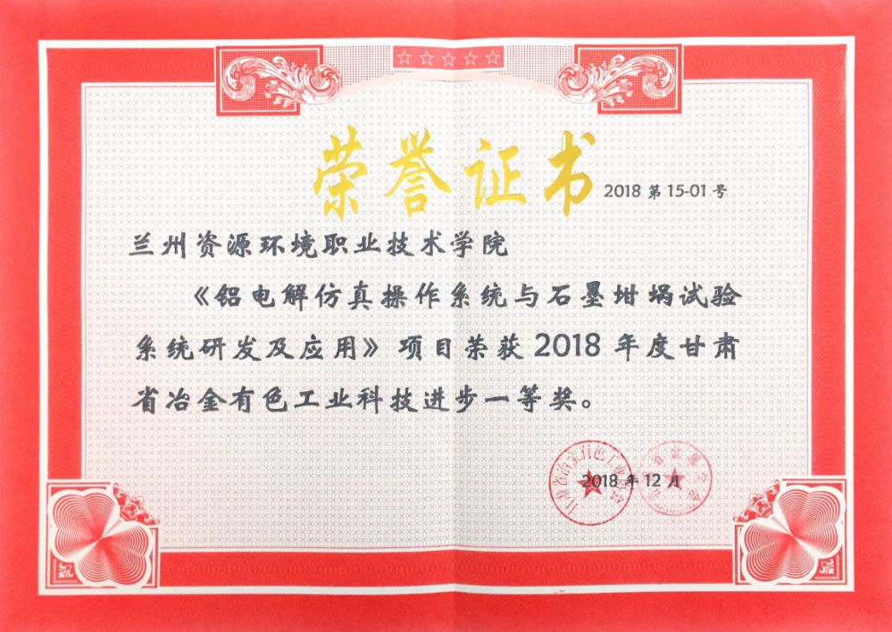 2018年甘肃省冶金有色工业科技进步一等奖
