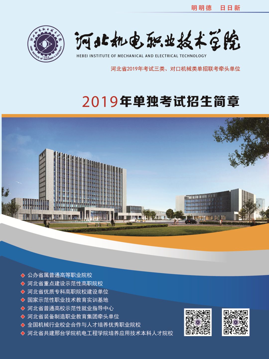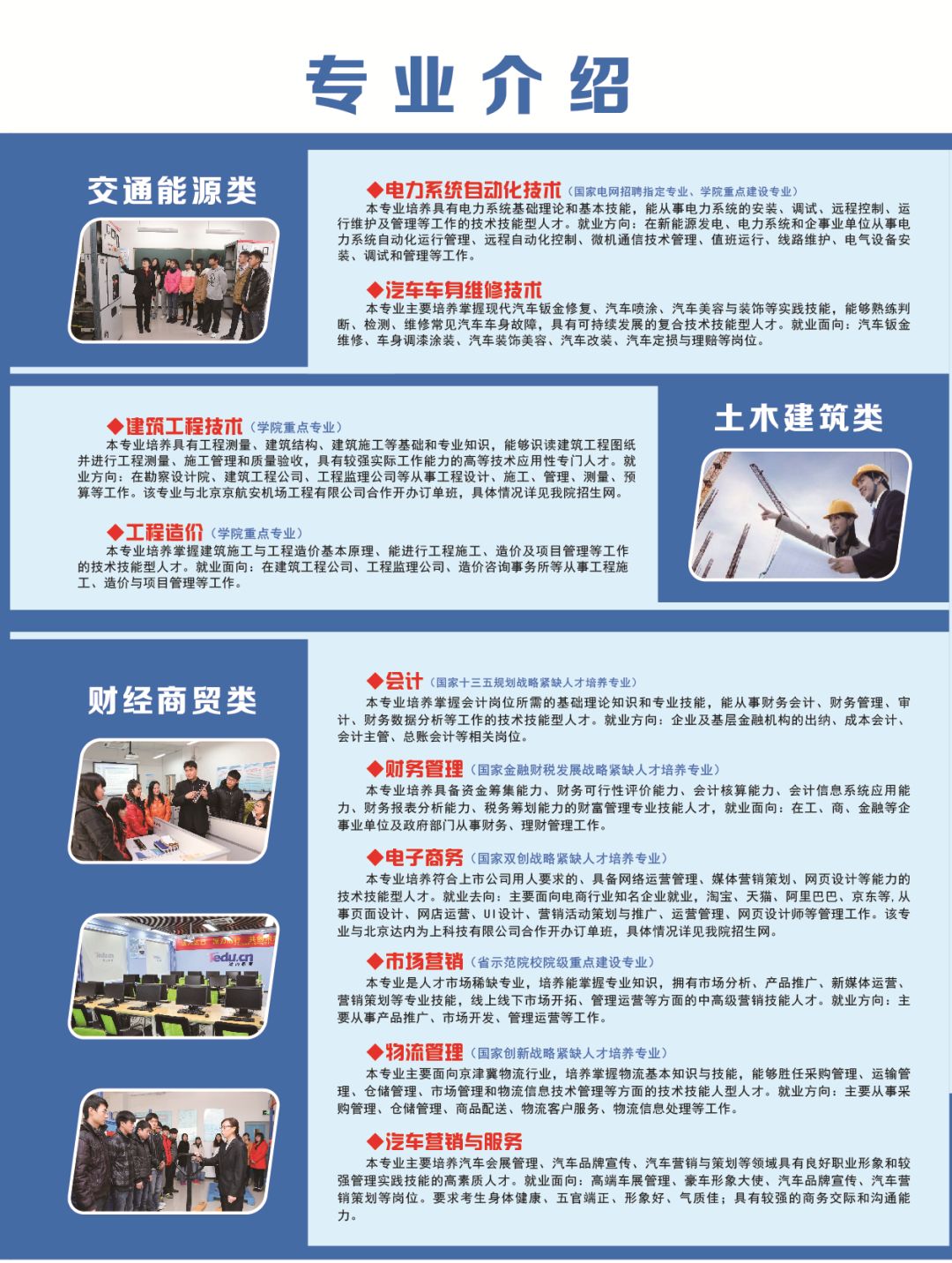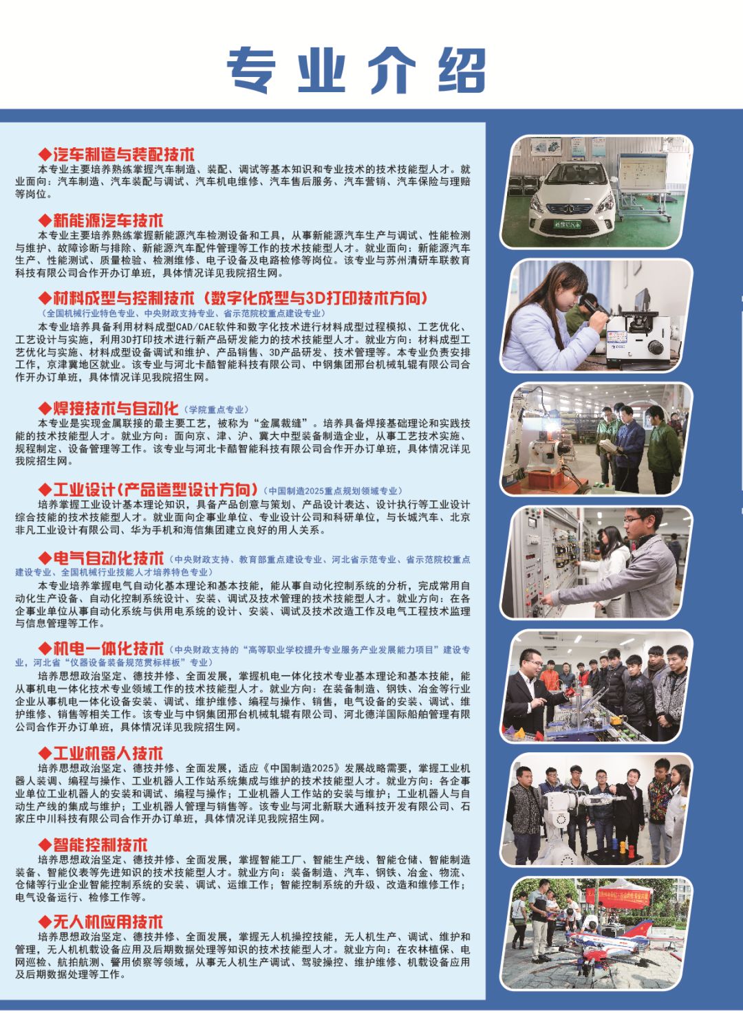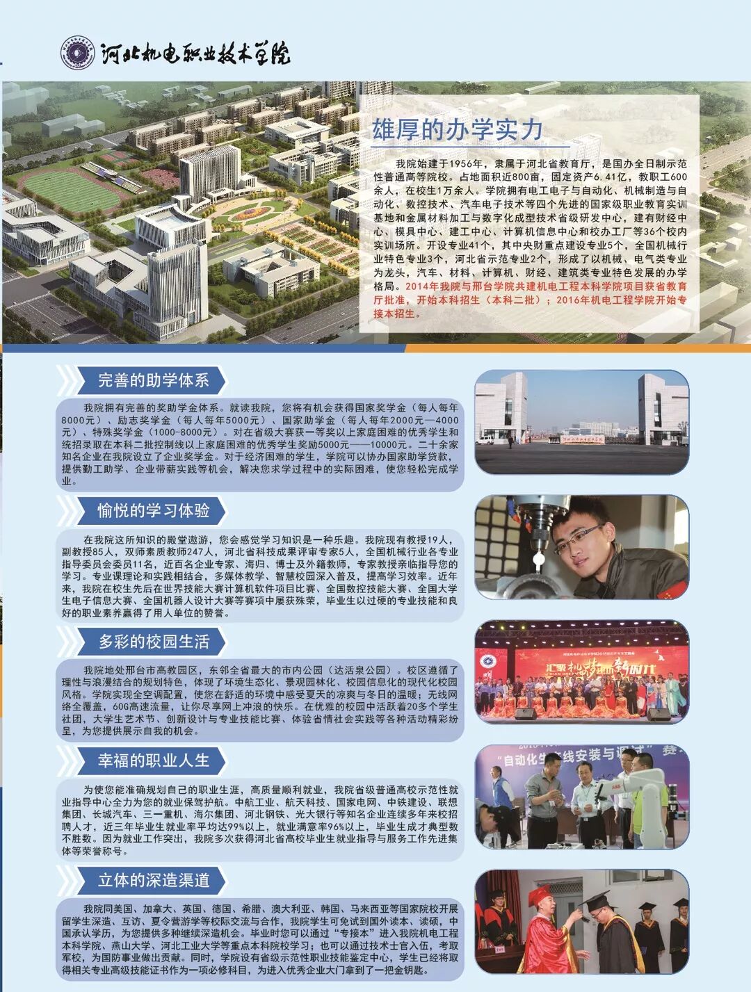 学院2019年单招计划总数3600人,包括统考六个大类,对口五个大类,欢迎广大考生积极填报我院单招志愿。 (1)考生填报我院单招志愿时,可直接参照此表中院校代号、专业代号和计划数等信息。 (2)志愿填报时间:4月11日9时至14日17时,一志愿网上填报。4月20日9时至21日9时,二志愿网上填报。 (3)志愿填报流程:登陆河北省教育考试院网站(http://www.hebeea.edu.cn/)进入“河北省高职单独考试招生填报志愿系统”进行志愿填报,考试登陆需要输入考生号、密码和验证码。(初始密码为考生身份证号后8位)。 注:考生可填报我院为第一个院校,在填报专业时,选择考试类中自己想学的专业,按照顺序填报专业,最多可选择6个专业。 祝各位考生能如愿以偿的被心仪专业录取,期待九月我们的相遇! 咨询电话:0319-8769861、8769862、8769858、8769859 官方QQ:1956456789