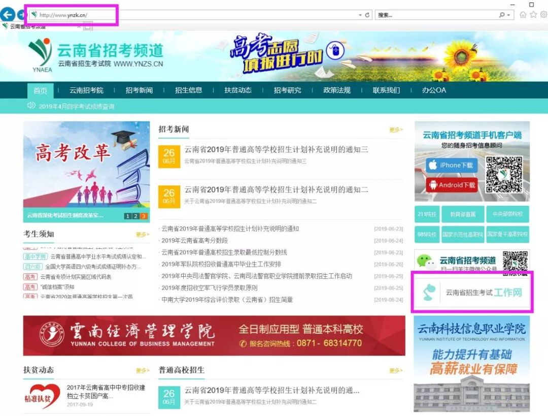 网址(http://zs.ynjgy.com),学校有关本专科生招生方面的信息均在该网站发布。还可以通过网站方便快捷地查询各省各专业招生计划、近几年的录取分数线、为考生报考提供数据参考;录取后,还可以查询通知书的发放情况,同时可以浏览了解学校基本情况、专业、学生学习、就业以及生活等信息。