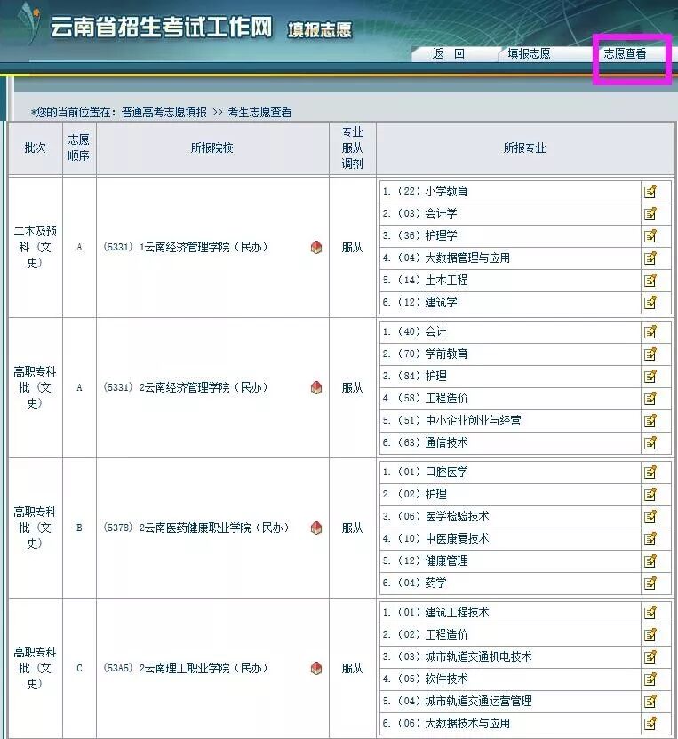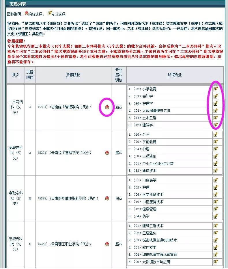 2、专科线上考生建议只填意向就读学校(如:云南经济管理学院A志愿)。