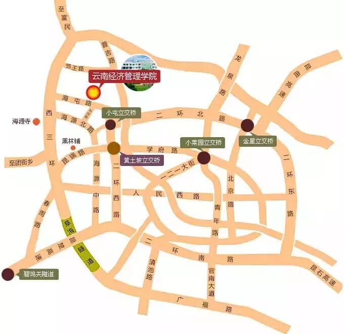 海源校区:到昆明后请乘2 路、26 路、55 路、70 路、83 路、90 路、106 路、116 路、127 路、133 路、138 路、146 路、168 路、C16 或C61 路等公共汽车到黄土坡转乘113(昆师路口←→海源寺)或C63 路公共汽车直接到我院。