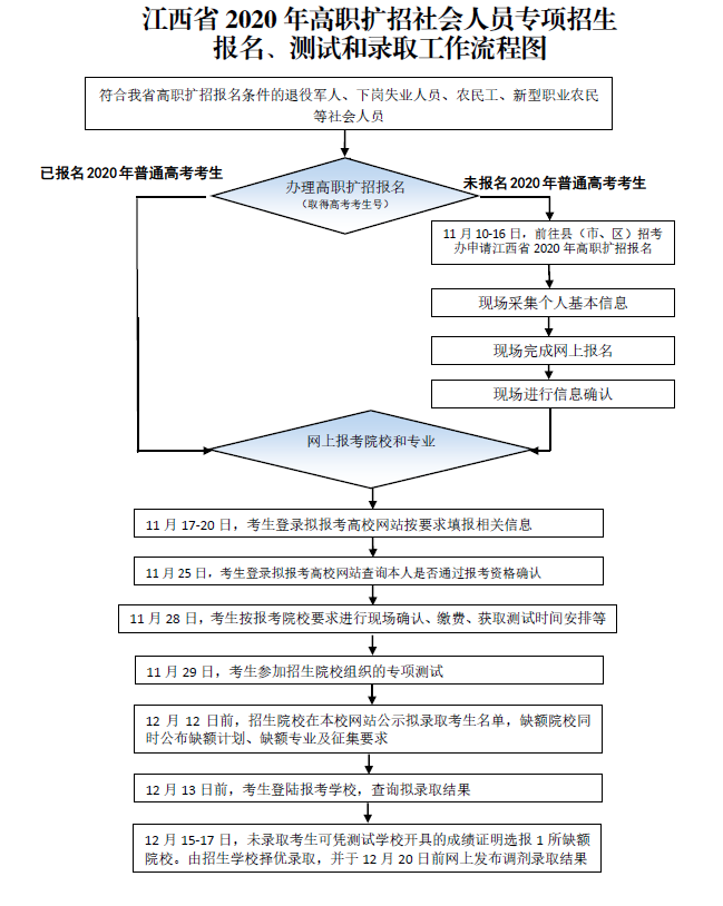 江西省2020年高职扩招社会人员专项招生报名、测试和录取工作流程图