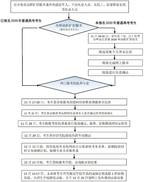 江西省2020年高职扩招社会人员专项招生报名时间为2020年11月10日上午9:00—16日下午17:00,逾期不补报。