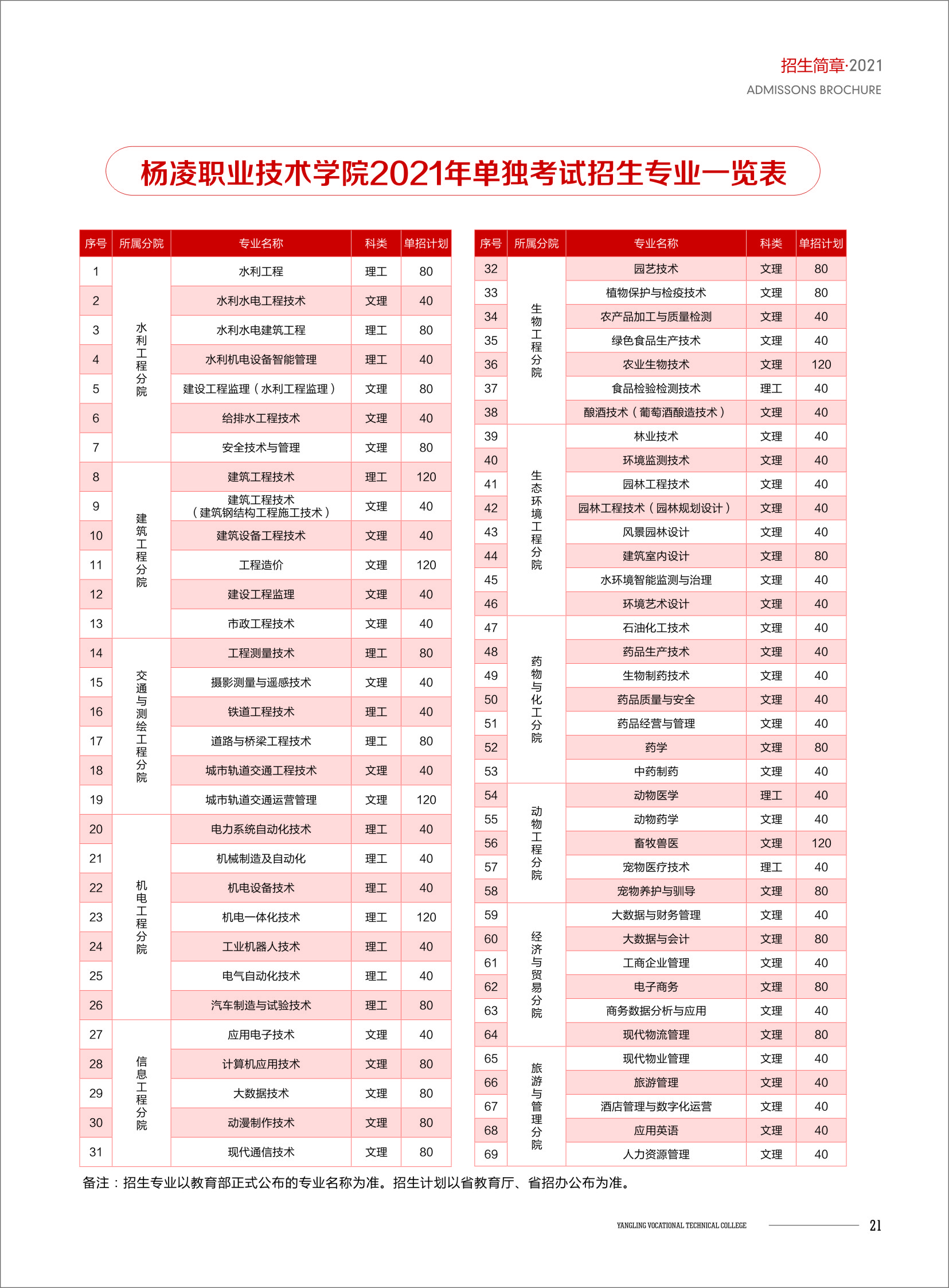 杨凌职业技术学院2021年示范高职单独考试招生专业