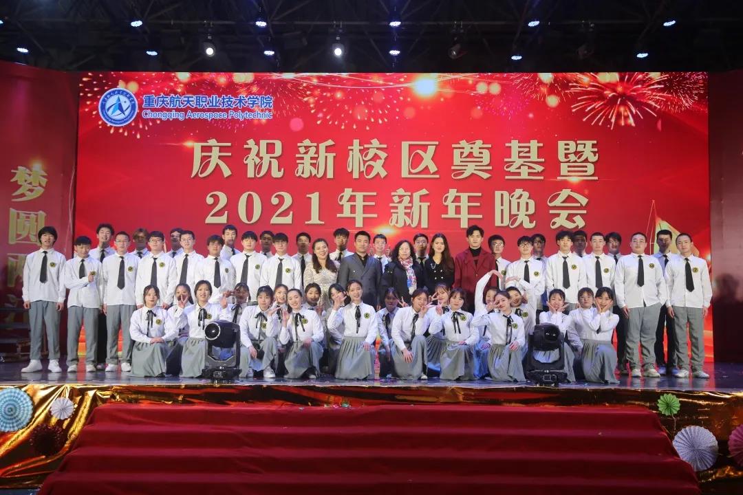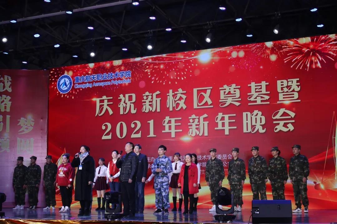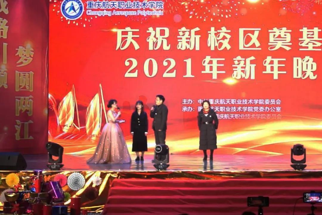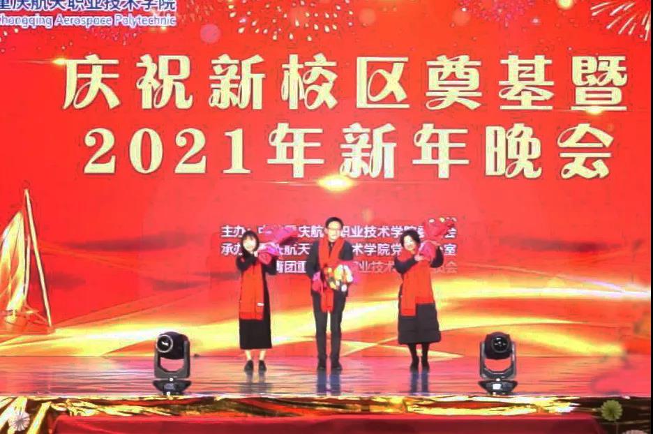 学校校长王勇、**书记赵晓峰先后上台致辞。 王勇校长代表学校党政领导班子,向莅临晚会的各位领导和来宾表示热烈的欢迎,向学校离退休老同志致以诚挚的问候,向呕心沥血、奋力推进学校发展的全体师生员工表示衷心的感谢,并祝愿全体师生新年快乐、阖家幸福。他指出,即将到来的2021年是“十四五”的开局之年,是双高校建设的攻坚之年,是落实学校“1226”发展战略规划的关键之年。在今天,我们共同见证了学校新校区破土奠基。在上级的坚强领导下、在各界的支持下,一座航天特色鲜明、产教融合型职业校园将在两江新区航天航空产业园迅速拔地而起!学校将持续秉持和发扬航天三大精神,发挥央企办学优势,用实干去成就梦想,用拼搏去收获成功!