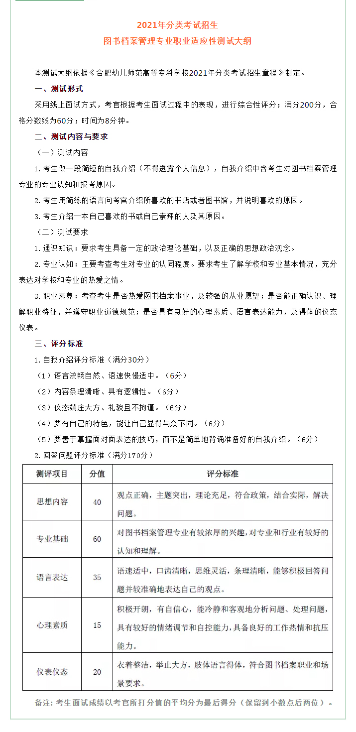 合肥幼儿师范高等专科学校2021年分类考试招生图书档案管理专业职业适应性测试大纲