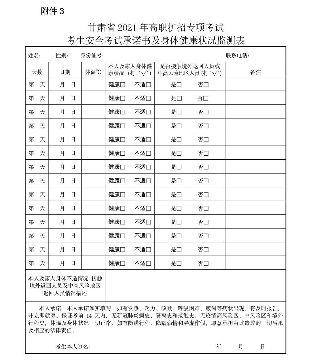 3.2021年甘肃省高职扩招专项考试考生安全考试承诺书及身体健康状况监测表
