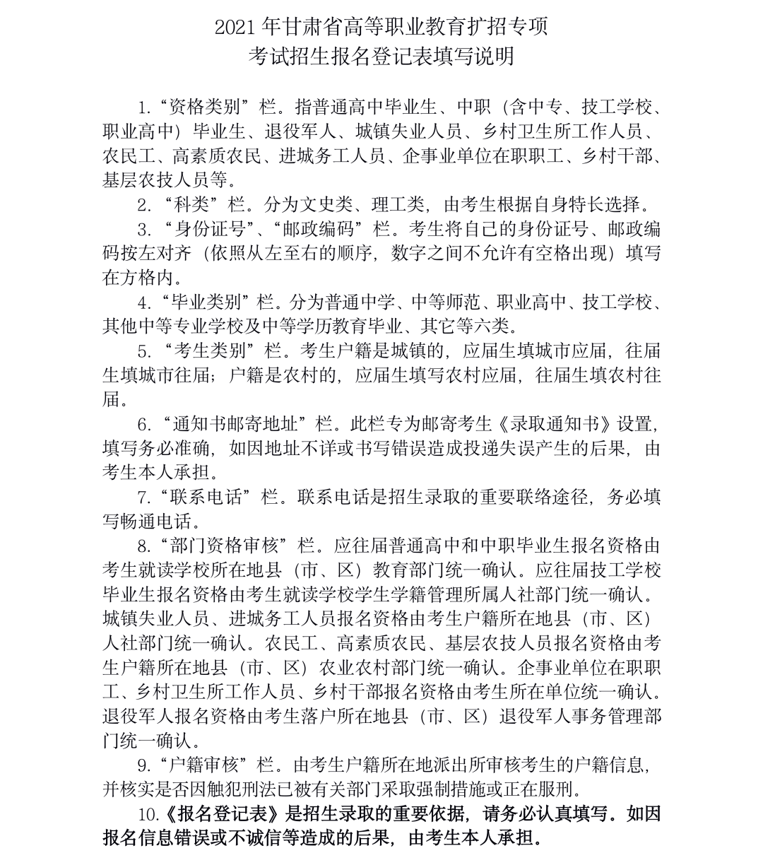 附件:1.2021年甘肃省高等职业教育扩招专项考试招生报名登记表