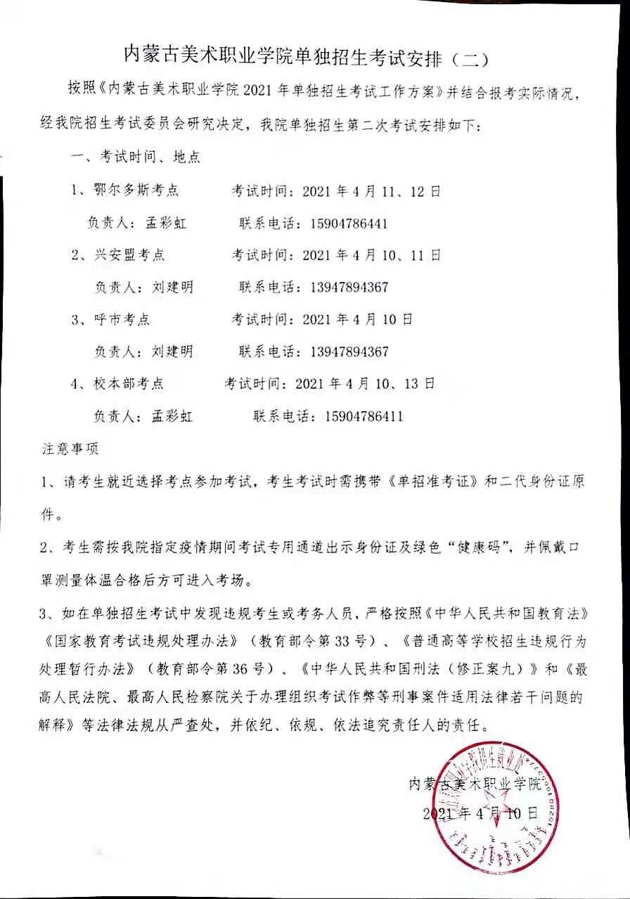 2021年内蒙古美术职业学院单独招生考试安排