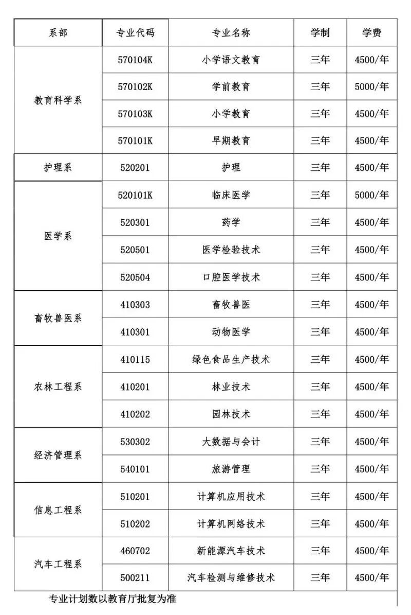 赤峰应用技术职业学院2025年单招专业计划 科类 专业代号 专业名称 学制 学费 计划数 办学地点 备注 对口招生-牧医类 A1 畜牧兽医 三年 5000 130 校本部 对口