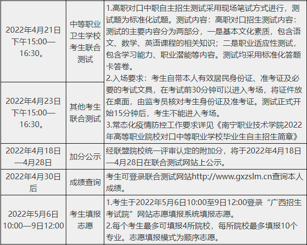 我校会同区内34所高职高专院校,共同组建2022年广西公办高职高专院校招生联盟,按照“整体策划、统一申报、现场笔试、成绩互认”的原则,开展高职对口招生联合测试工作,取得联合测试成绩的考生才具备被我校录取的资格。