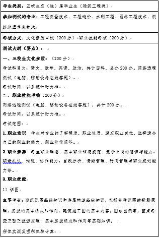 为贯彻落实《国务院关于深化考试招生制度改革的实施意见》(国发〔2014〕35号),加快推进高职(高专)院校分类考试,深化高职院校单独招生改革,今年普通高中应(往)届毕业生实行“普通高中学业水平考试11门科目成绩+职业适应性测试”评价方式,选拔综合素质高,创新、实践能力强的优秀学生,更好地培养适应经济社会发展的高技能人才,并为确保我院单独招生工作公平、公正、公开、按时、顺利地完成,特制定本大纲。