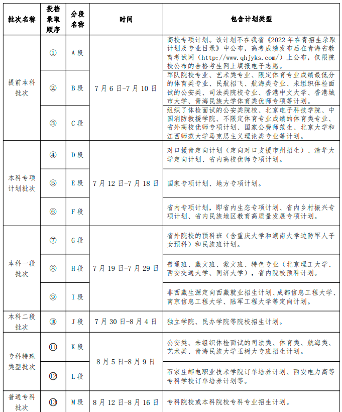 注:以上各批次投档录取时间仅供考生参考。省考试院将于每一批次投档录取开始前,在青海省教育考试网和青海省教育招生考试(微信公众号)发布该批次录取进度安排及相关事宜。