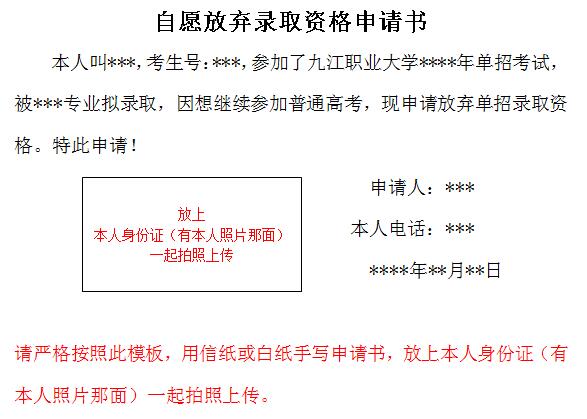 3.确定放弃录取资格的考生务必于4月26日17:00前用纸写好申请书,并把身份证(有本人照片那面)一起放在申请书上用手机拍照后发送到指定邮箱326302328@qq.com,并来电确定是否收到,申请书详见附件(样板)。
