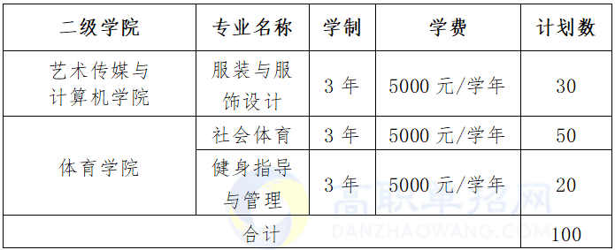 艺术类招生计划 30人,体育类招生计划70人,文、理、三校兼收。考试科目:文化素质考试+职业技能测试。