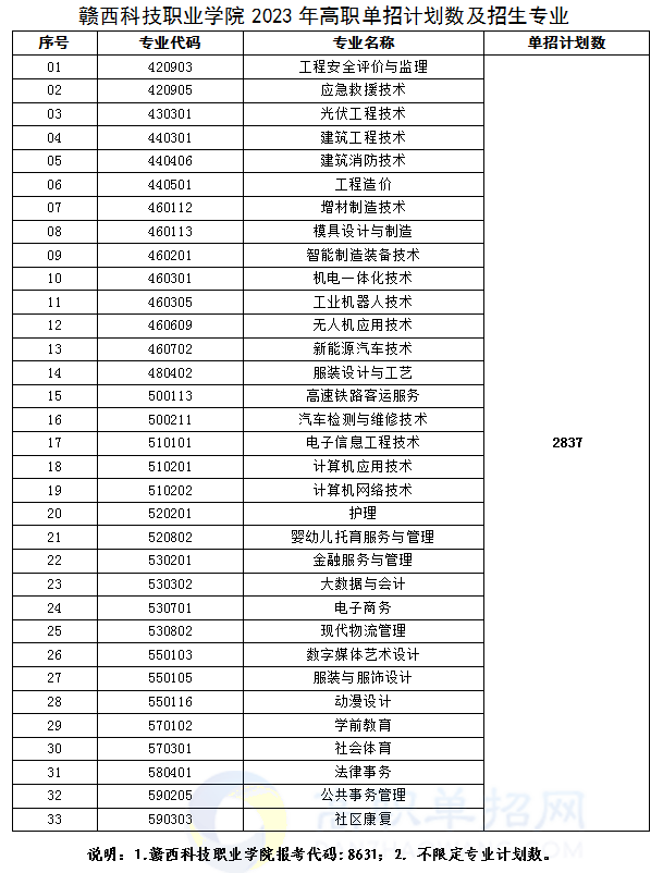 赣西科技职业学院 2023年高等职业教育单独招生专业