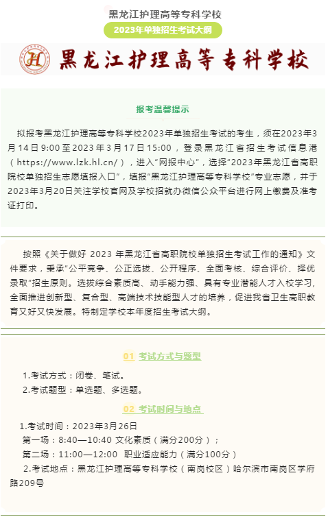 黑龙江护理高等专科学校2023年单独招生考试大纲
