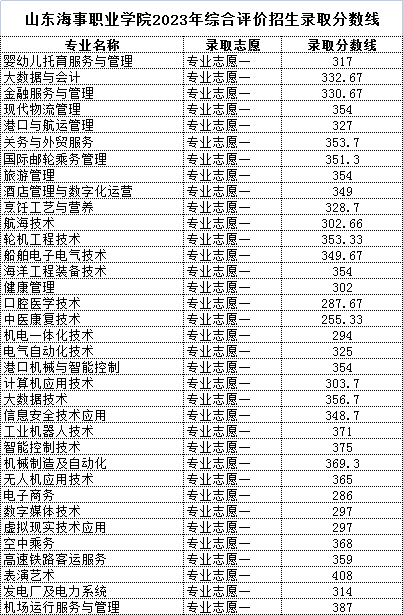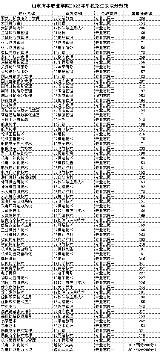 山东海事职业学院2023年单独招生和综合评价招生分专业分类别录取分数线