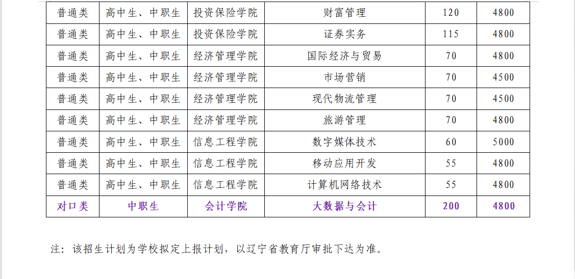 辽宁金融职业学院2023年单独考试招生专业及招生计划安排(拟定)