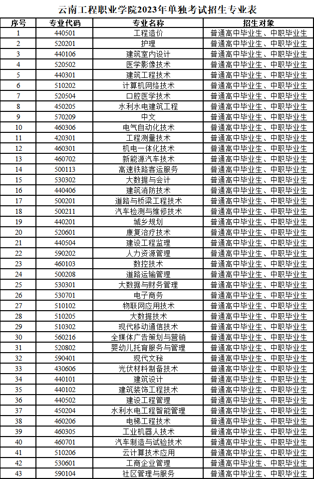 以上就是【云南工程职业学院单招专业有哪些】全部信息,希望在2024年云南省单招考试中可以帮助到你!由于每年的录取分数都会有所变动,具体请以学校公布的最新分数线为准。本信息只作为参考,不作为报考依据。若还想了解云南省单招更多学校真题及答案请访问:http://www.danzhaowang.com/shiti/ynenc.html