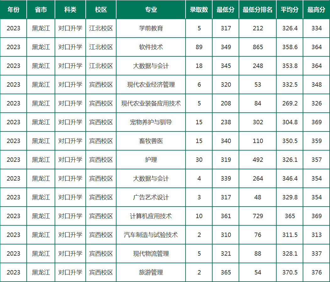 黑龙江农垦职业学院2023年对口升学分专业录取分数线