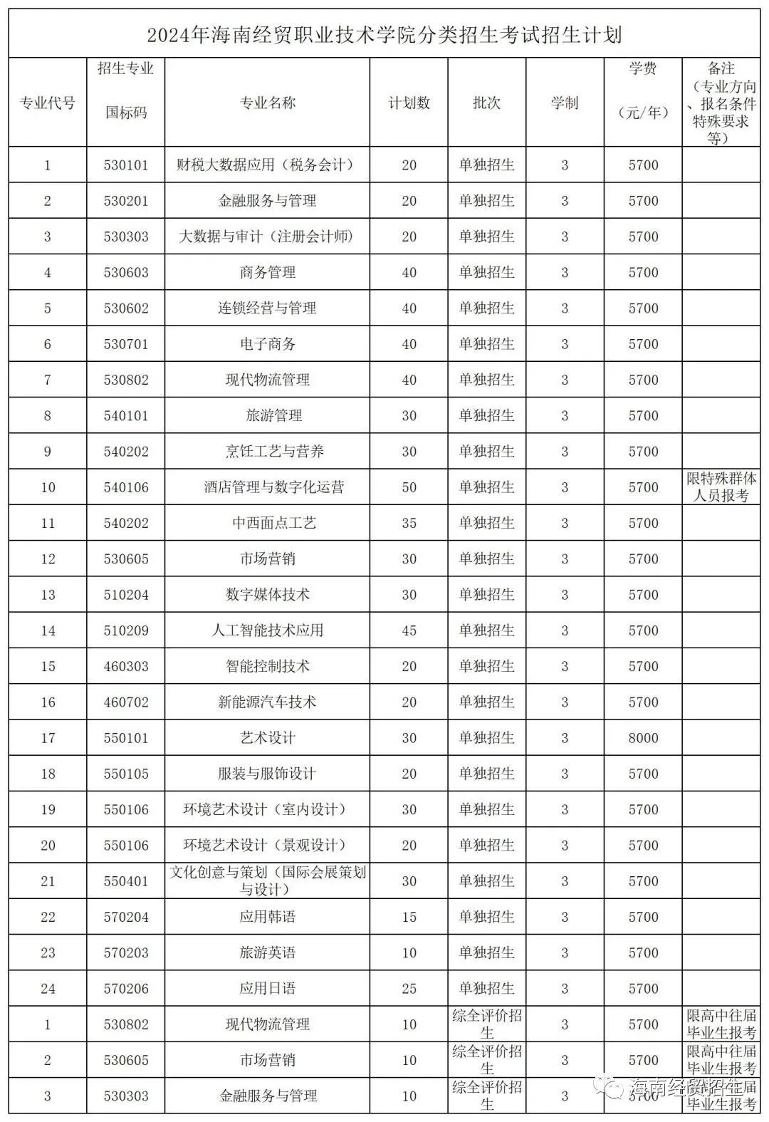 2024年海南经贸职业技术学院分类招生考试招生计划