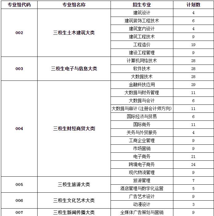 (二)三校生类专业组招生计划(专业组代码:002-009)