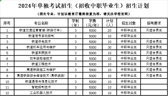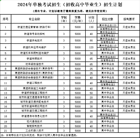 2.计划在铁道交通运营管理 (铁路行车)、铁道信号自动控制、铁道供电技术、铁道机车运用与维护、铁道车辆技术、铁道工程技术和铁道通信与信息化技术7个专业招收部分体育特长生。