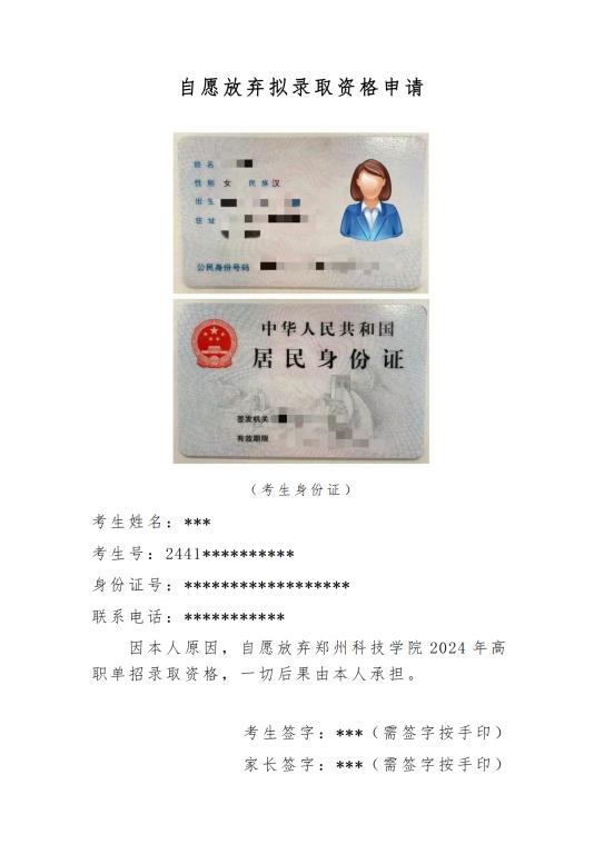 2.申请格式:考生需手写自愿放弃拟录取资格申请(申请模板如下图),并将考生本人与家长身份证正反面复印在同一页,家长和学生签字后分别按手印。