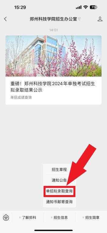 3.微信公众号:微信关注郑州科技学院招生办公室微信公众号,点击主页下方{招生信息},选择{单招拟录取查询},进入系统查询即可。