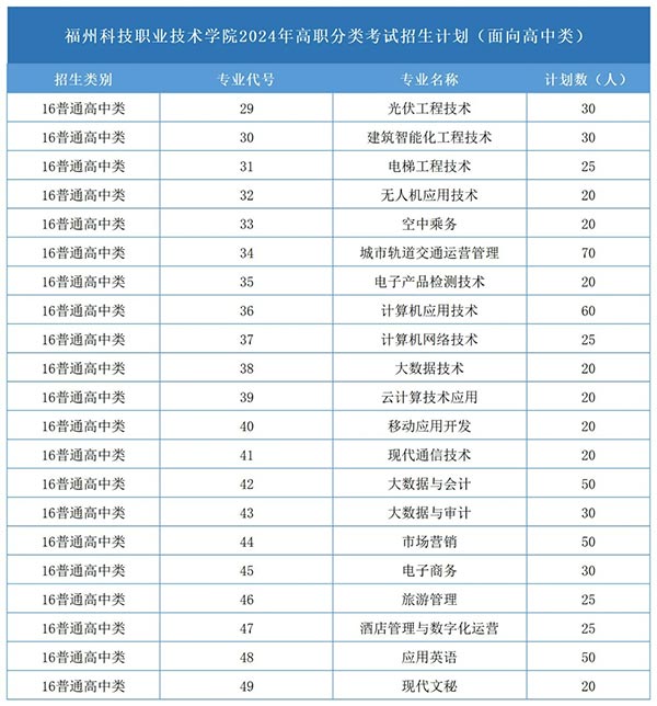 福州科技职业技术学院2024年高职分类考试招生计划