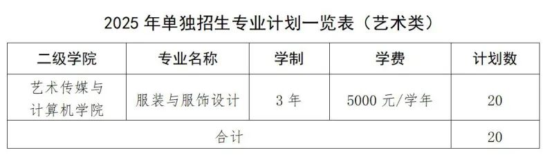 艺术类招生计划 20人。考试科目:文化素质全省统考+职业技能测试(艺术类)。