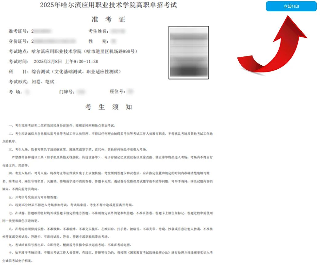 (3)查询到准考证,先查看个人信息是否与实际相符,确认无误后,点击“立即打印”,打印准考证。
