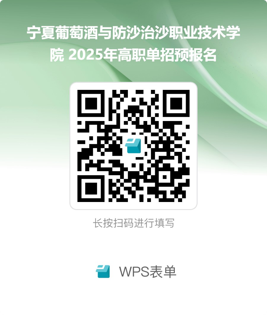 第二十条 报名办法:考生扫描报名二维码或电话联系学院学生工作部(招生与就业指导中心)登记信息进行预报名。预报名成功后,考生还需登录宁夏葡萄酒与防沙治沙技术学院网站招生就业工作专栏(http://www.nxfszs.cn/zsjy/zsgz/)下载《宁夏葡萄酒与防沙治沙职业技术学院2025年高职单招考生报名表》和《考生诚信承诺书》并按要求如实填写,在确认填写无误后,将扫描件发送至邮箱1583362538@qq.com即可。