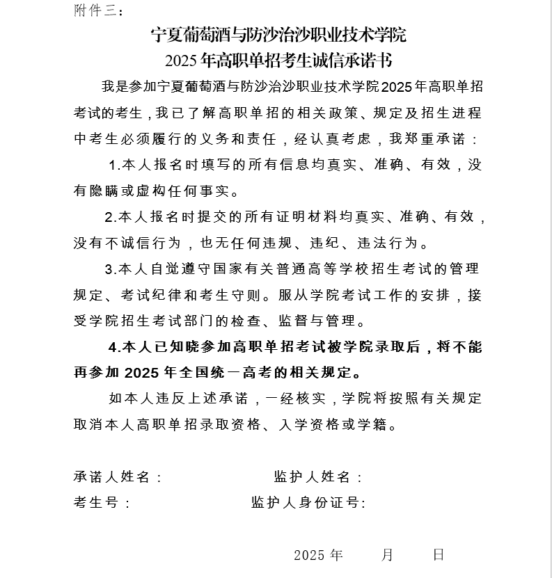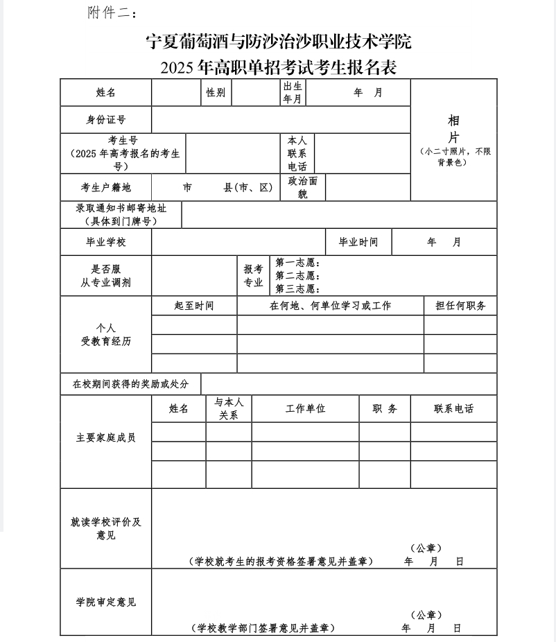 2.宁夏葡萄酒与防沙治沙职业技术学院2025年高职单招考生报名表(需加盖考生所在毕业学校教学部门公章)。