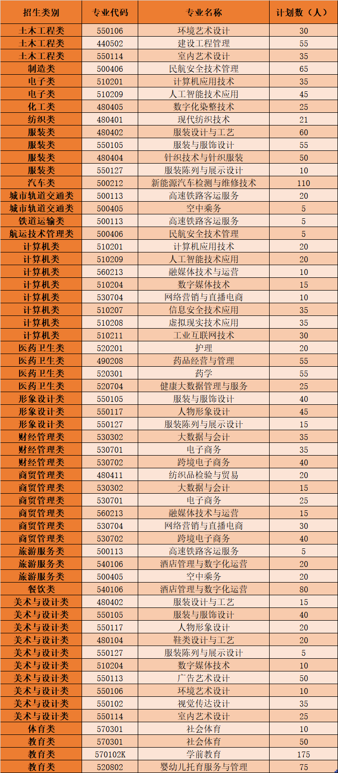 2025年泉州纺织服装职业学院高职分类考试招生计划