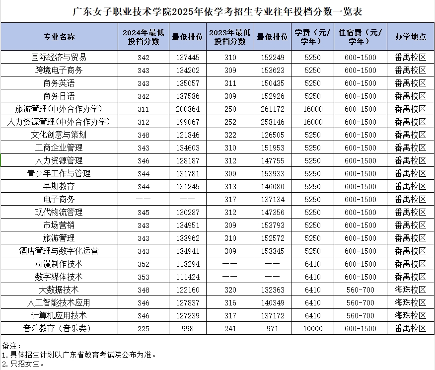 广东女子职业技术学院2025年春季高考招生专业往年投档分数情况一览表