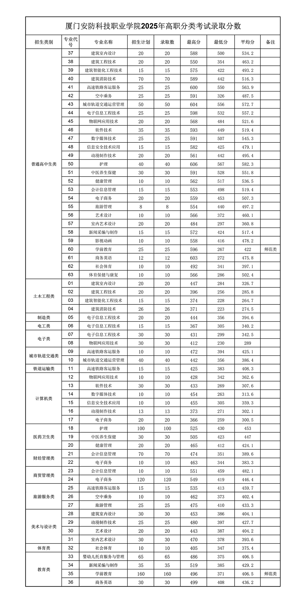 厦门安防科技学院2025年福建省高职分类考试录取分数