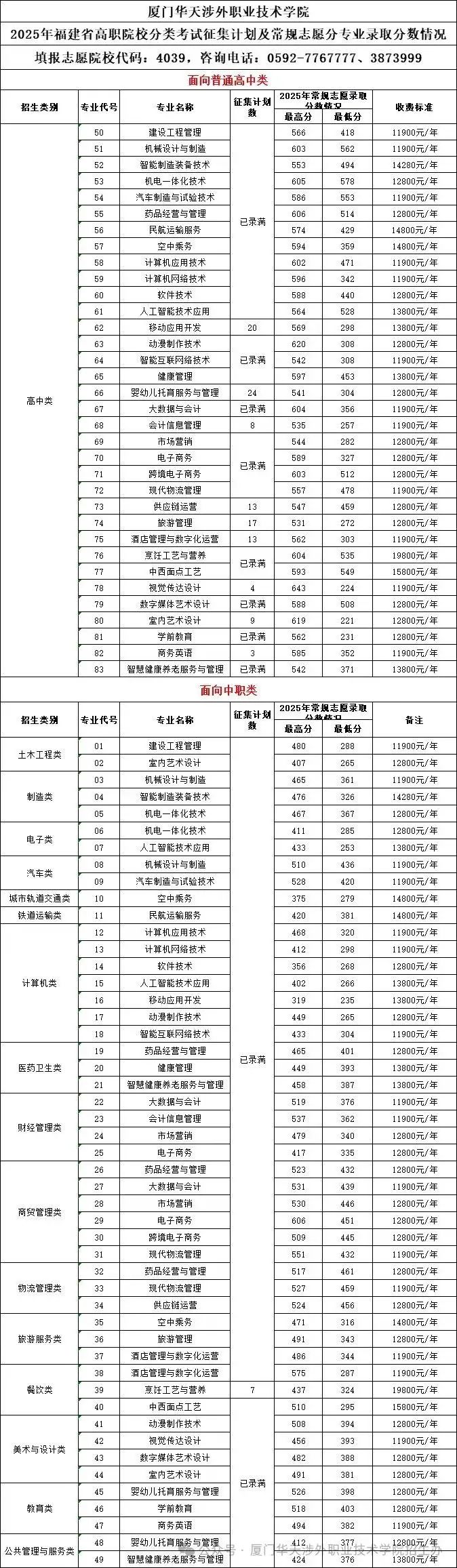 厦门华天涉外职业技术学院2025年高职分类考试分数线