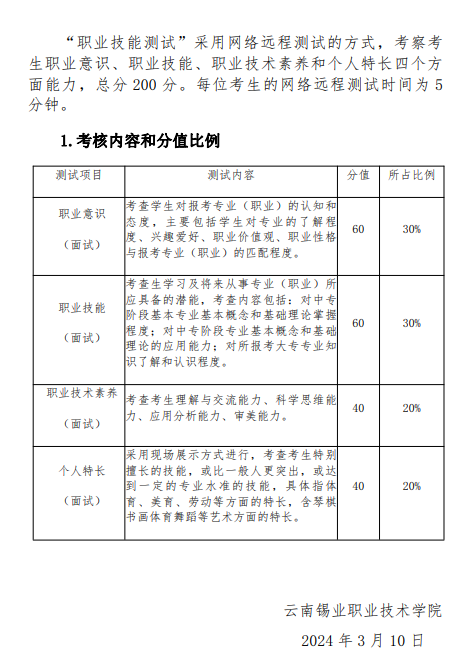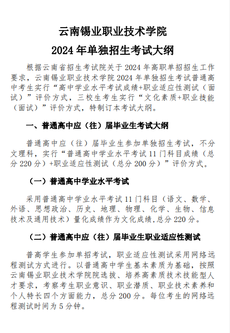 2024年云南锡业职业技术学院单独招生考试大纲